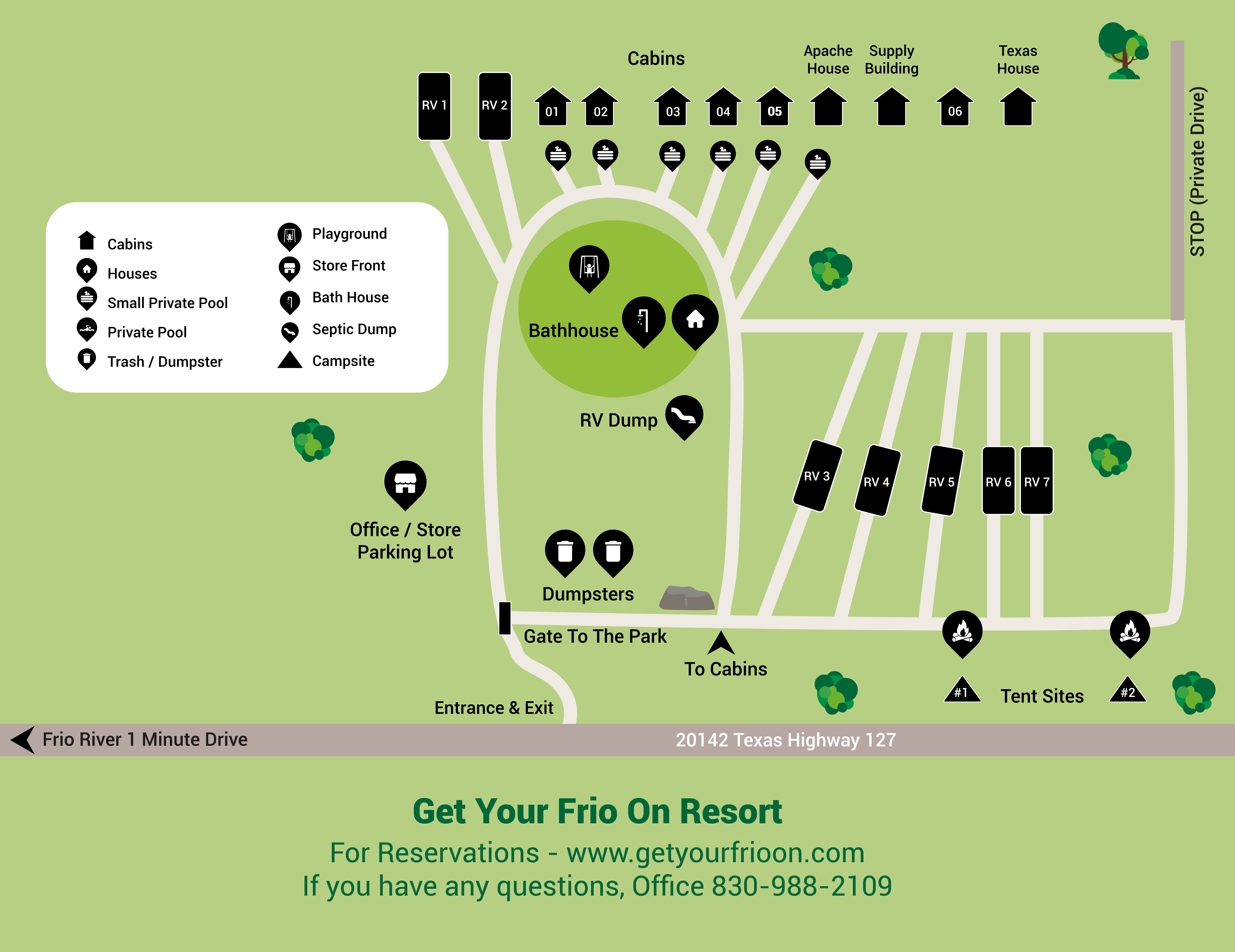 Welcome to Get Your Frio On! We are a full service lodging location 850 yards from an entry point to the Frio River in Sabinal, TX. We have The Cowboy House that sleeps 18, Cabins 1-6 that sleep anywhere from 6-12 people, Pull through and back in RV slots, and two camp ground locations on the property for tent camping! We have a full service bath house with two showers, two toilets, and two sinks for both men and women.